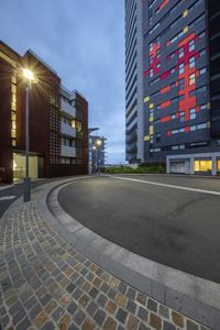 A stunning view of a city at night, with bright lights illuminating high-rise buildings and a road leading straight into the urban landscape.