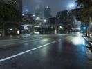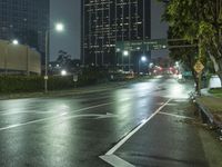 A crosswalk in the city of Los Angeles, California, USA on a wet, foggy night illuminated by artificial light. The modern architecture and infrastructure of the metropolitan area in the background reflects off the wet asphalt roads and the glass structures. The skyline of the coastal cityscape stretches above the trees and the clouds, providing a unique recreation of the public space and its water resources.