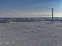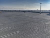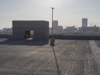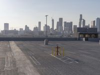 The sprawling city of Los Angeles, California, USA is a mix of modern architecture, cityscapes, and concrete streets, with the occasional patch of green, all punctuated by sun and clear skies. This image captures the tints and shades of grey in the asphalt parking lot, the high-rise residential area, and the composite material of the parking garage. The horizon is dotted with skyscrapers and towers, with a few clouds in the distance.