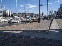 A view of the Bremerhafen pier, with the horizon of the city of Bremen visible in the background. The lake is dotted with boats and the road surface is a cobble stone. The urban design includes a highway entrance, exit and ramp, as well as modern architecture, residential areas, street lights, masts, and a boat ramp.