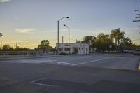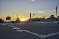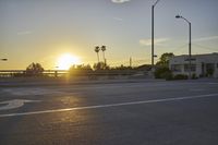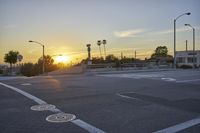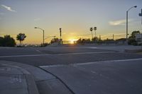 A scenic view of a suburban residential area in Los Angeles, California, USA, at dawn. The sun casts a warm golden light on the tree-lined streets, illuminating the yellow road lines and asphalt road surface. The clear sky is dotted with fluffy clouds and contrails, creating a picturesque urban landscape. The street lights start to fade as the sun rises, signaling the beginning of a new day in this vibrant city.