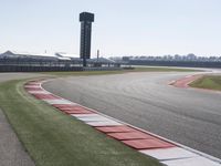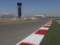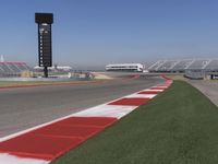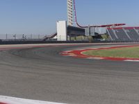An aerial view of a metropolitan area with a highway leading to a motorsport race track, while an airplane passes by in the clear sky. The grandstand, control tower, and corporate headquarters provide a glimpse of the architecture and infrastructure of the city.