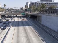 A straight-down view of a city road with a bridge underpass and controlled-access highway. Automobiles travel along the lane and pass into a metropolitan area, past urban buildings and a residential area. The clear sky is filled with contrails and a few clouds in the distance.