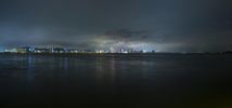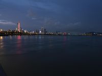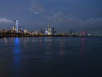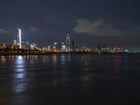 A serene atmosphere of calm and artificial light engulfs the skyline of the Shenzhen metropolitan area after dark, in Guangdong Province, China. The coastal cityscape, featuring the city, lake, ocean, sea, river, and shore, is mirrored in the reflection of the clouds on the horizon.