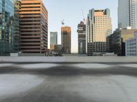 An abstract view of a metropolitan area, featuring concrete and asphalt surfaces, tall high-rises, and a parking garage in the foreground, all under a clear sky and hard shadows.