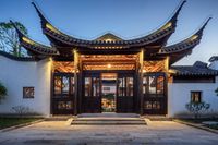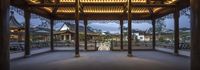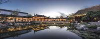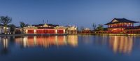 A stunning view of the residential buildings and houses straight down the road in Chongqing, China. The first light of dawn illuminates the city's profile, creating a mesmerizing sight. The suburban area features a beautiful courtyard villa and a place of worship, a serene temple. The leisure resort comes alive with artificial light, reflecting on the smooth surface of the lake. This image showcases the captivating blend of Chinese and Japanese architecture in Chongqing, capturing the essence of Asia's architectural beauty.