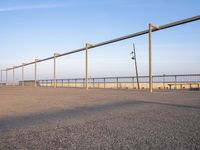 A serene view of the low coastal city of Barcelona at dawn, with concrete streets, sandy beaches, and calm waters reflecting the clear sky and clouds. The city's urban design features a road surface, trees, fences, and a net sport area near the pier. This elevated cityscape offers a peaceful start to the day in Europe.