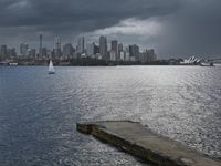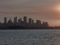 A stunning view of a city skyline at dawn, with skyscrapers reflecting in the water.