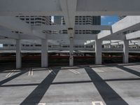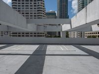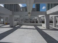 An aerial view of Miami Beach, Florida, from a high position straight down the road. The concrete surface of the parking lot, urban design, and cloud-dotted sky are all visible in this daylight shot.