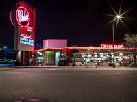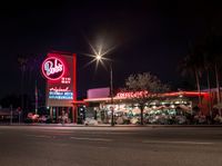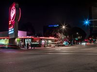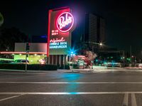 A stunning view of a cityscape at midnight in California, with buildings illuminated by artificial lights and street lights casting a warm glow on the asphalt streets.