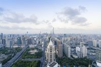 A high-rise view of Shanghai's metropolitan area, showcasing the city's modern architecture and bustling urban metropolis against a cloudy sky.