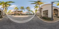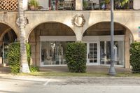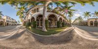A beautiful residential building with classic architecture in a beach town, surrounded by lush vegetation and tall trees.