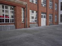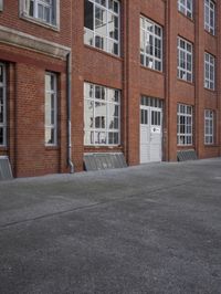 An open space featuring cobble stone and asphalt roads, a brick wall, and a classic office building provide an urban landscape in a residential area of Berlin, Germany. Sunlight casts shadows on the facade and brickwork of the building, while people go about their day in the business district. A door and window in the Hinterhof provide a profile of an apartment building and home in the area.