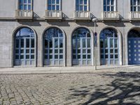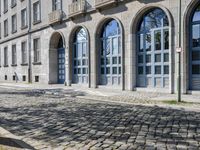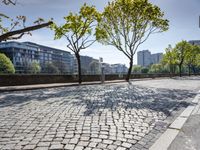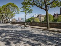 A view of classic architecture in Berlin, Germany on a sunny day. The road is lined with cobblestone and vegetation, and the buildings feature brickwork facades, blue sash windows, and archways. The area is a residential neighborhood populated with trees and public spaces.