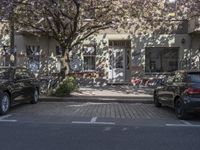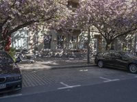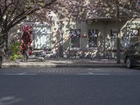 A snapshot of a classic architecture building in Berlin, Germany, surrounded by lush vegetation and cherry blossom trees in the spring.