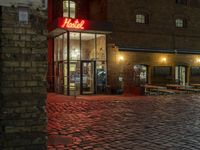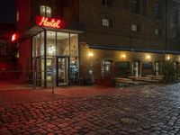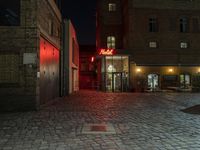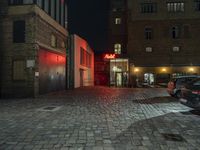 A mixed-use building stands out amongst cobblestone roads and classic architecture in Berlin, Germany. The building's facade is illuminated in the night by artificial light, revealing a brick and tile flooring in a red-light district alley-way. A small road surface in the foreground provides access to a hidden courtyard and urban design elements, like a warehouse or hostel, in the background.