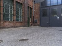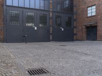 brick patio next to building with large doors near windows with no people on it and an empty space between two buildings
