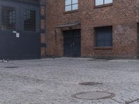 A beautiful example of classic architecture in the city of Berlin, Germany. The building's facade showcases intricate brickwork and wooden fixtures, while the cobblestone road adds to the charm of the urban design.
