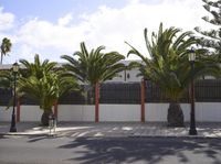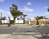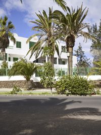 A residential area of Fuerteventura, a Spanish island, is pictured, with classic architecture, a road, trees, and vegetation providing a rural landscape. The Date Palm, a species of Arecales, is a prominent feature of the neighborhood.