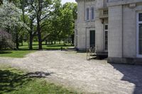 A view of a historic castle with lush vegetation and clear skies in Hamilton, Ontario, Canada