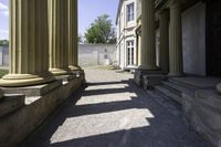 A classic architecture building in Hamilton, Ontario, Canada, featuring a wooden door, concrete facade, and symmetrical columns.