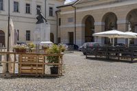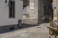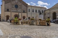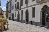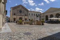 A view of a classic architecture building in Italy, with cobblestone road and residential houses. The facade of the building has windows and a courtyard, surrounded by vegetation and suburban village. The blue sky with clouds and shadows adds to the charm of the scene.