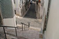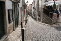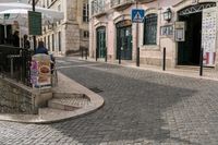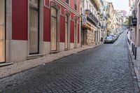 A picturesque view of a classic architecture in the residential area of Lisbon, Portugal, with cobble stone roads and a clear blue sky.