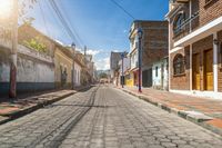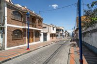 A picturesque residential area in Ecuador showcasing classic architecture and cobblestone alley-ways on a clear sky day.