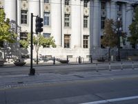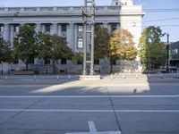 A view of a classic architecture building in Salt Lake City, Utah, USA. The building is located in a beautiful residential area with tree-lined streets and a vibrant downtown. The clear sky casts hard shadows on the asphalt road, highlighting the intricate facade of the building. The public space in front of the building features a courtyard with lush vegetation and a plaza for people to gather and enjoy the urban atmosphere.