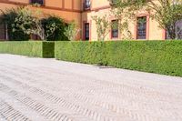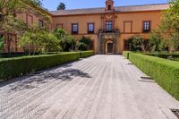 Residential villa with classic architecture in Seville, Spain. The straight road leads to the Royal Alcázar of Seville, surrounded by beautiful hedges and a well-maintained urban garden in the backyard. The surface is paved with elegant pavers.