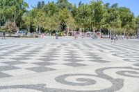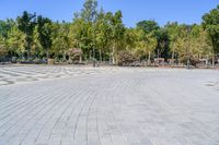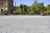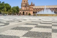 A view of the beautiful classic architecture in Seville, Spain, showcasing a town square, a castle, and a plaza de España. The clear sky and natural surroundings add to the charm of this urban location.