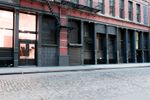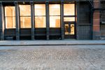 A city street in the Soho neighborhood of Manhattan, New York City, USA. The cobble stone road is illuminated by artificial lights from the classic architecture of the store fronts at dawn.