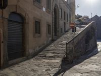 A cobble stone alley-way in a residential neighborhood of a Tuscan village leading to a highway entrance and exit, with open space and sunshine visible. The road surface winds its way through the valley, lined with classic Italian architecture and gardens.