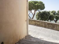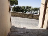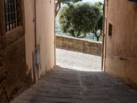 This residential property along a winding alley-way in Tuscany, Italy, features a classic stone wall, a lush garden with tree vegetation, and a window overlooking the neighborhood. A straight down the road view reveals the town's infrastructure with traditional buildings, roads, and floors.