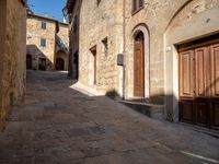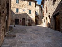 A cobble stone road winds through a picturesque Italian village, past a row of classic architecture buildings with open space gardens and clear blue skies. The road surface, flooring and arch profile complete the stunning view in the Tuscan valley.