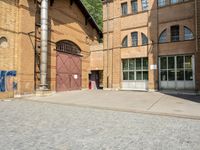 A residential neighborhood in Berlin, Germany comes to life in the daylight. Cobblestone roads and classic brickwork architecture, complete with iron doorways and window frames, line the streets. Graffiti walls, trees, and open spaces create a unique urban atmosphere.