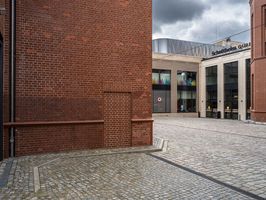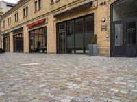 A beige brick wall with a black door and a cobble stone floor is seen in a classic alley-way in Berlin, Germany. The urban design of the neighborhood is highlighted by the stone wall, asphalt road surface, and vegetation in the foreground.