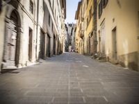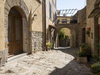 A day spent walking through the cobble stone laneways of a residential Italian village in Tuscany, Europe. The sun casts hard shadows on the classic architecture of the buildings and infrastructure, creating a picturesque scene of urban life.