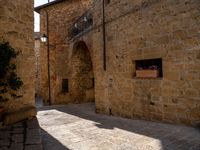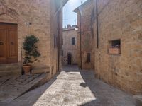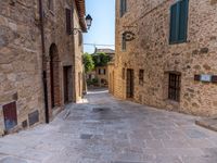 The classic architecture of a neighborhood in Tuscany, Italy is visible along the cobblestone alley-way, open space, and roads, stretching straight down the valley, with a clear sky above.