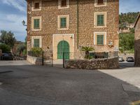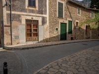 A paver road leads through a valley in the residential suburbs of Mallorca, Balearic Islands, Spain. The clear sky highlights the classic architecture in this European day-time village scene.
