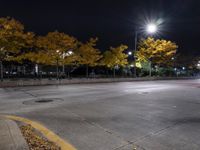 The classic urban architecture of Manhattan, New York, USA, stands out against the night sky, illuminated by the yellow artificial light of street lamps and the dark silhouettes of trees and woody plants that line the asphalt road.