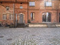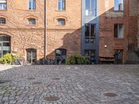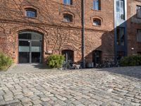 A classic urban landmark building in Berlin, Germany, with a clear sky, a cobblestone road surface, and a variety of materials from brickwork to asphalt, and hard shadows cast by its facade. The modern architecture and urban design of the Hinterhof neighborhood is visible in the bicycles, windows, doors, and loading dock fixtures.
