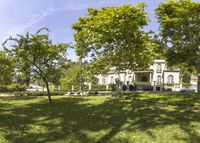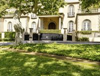 A classic villa stands tall in an urban estate, surrounded by natural grass and trees. The road in the foreground leads to the residential area, with open space and recreational areas surrounding the building.