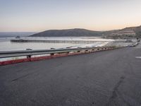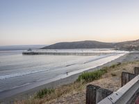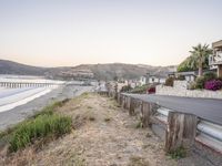 A stunning view of a coastal architecture at dawn in California, USA with a beautiful ocean, clear sky, and mountains in the background.