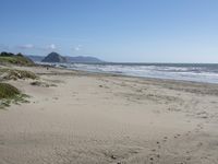 A picturesque view of the beautiful California coast, with its low sandy beaches, clear blue waters, and open spaces under a clear sky. The image captures the serene beauty of the ocean shore, with its wood floors, rock formations, and sandy beach. The architectural elements, such as the road, buildings, houses, and trees, add to the charm of the landscape. The natural environment, with its cliffs, waves, and vegetation, creates a peaceful and elevated bay area.