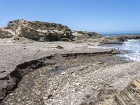A stunning view of California's coastal landscape, with sandy shores, crystal clear water, and a beautiful tree on the bedrock cliff.