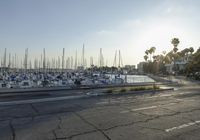 A vehicle is parked in a parking lot at a coastal city marina, overlooking the ocean on a bright day. The jetty surface and vegetation provide a peaceful open space, and a nearby pier leads out to the sea.