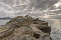 A stunning coastal cliff at dawn, with the sun visible on the horizon, illuminating the grey sky and casting a beautiful light on the rocky surface.
