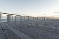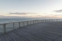 A serene morning along the low coastal line of Australia. The wooden walkway stretches out towards the horizon, leading to a bridge and a boardwalk. The calm ocean water reflects the clouds in the sky, creating a peaceful atmosphere.