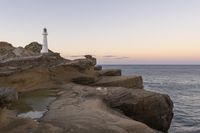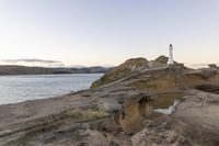 a lighthouse on the edge of a cliff overlooking the ocean and rocks in front of the light house